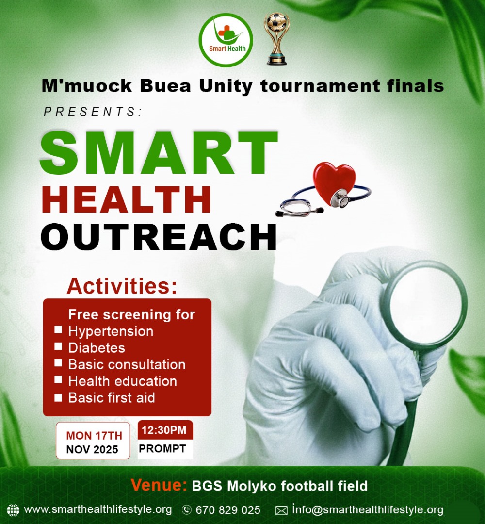 Smart Health is a community-driven initiative based in Buea, Cameroon, dedicated to reducing chronic diseases through education, fitness, lifestyle changes, and medical outreach. We empower individuals and communities to embrace healthier living, focusing on both physical and mental well-being. Our programs and activities are carried out through both physical events and online platforms, making health education and support accessible to everyone. Learn more…